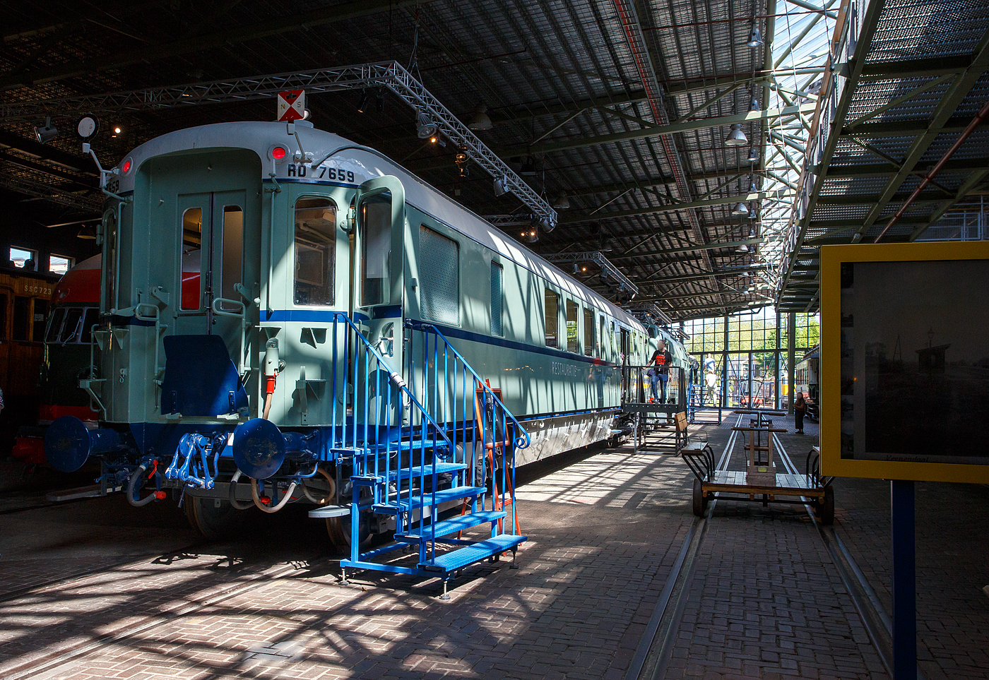 Der Gepäckwagen mit Fahrradanteil NL-NS 50 84 92-37 007-9 der Gattung Df, ex Personenwagen 3. Klasse mit Küche und Gepäckabteil CKD 6910, ein Wagen vom Typ Plan E, am 24. Juni 2025 im Het Spoorwegmuseum (bis 2005 NSM - Nederlands Spoorwegmuseum / Niederländischen Eisenbahnmuseum) in Utrecht im ehemaligen Bahnhof Maliebaan.