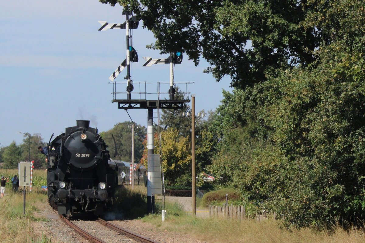 Am 7 September 2024 treft VSM 52 3879 mit Dampfpendelzug aus Apeldoorn während Terug-naar-Toen 2024 in Beekbergen ein.