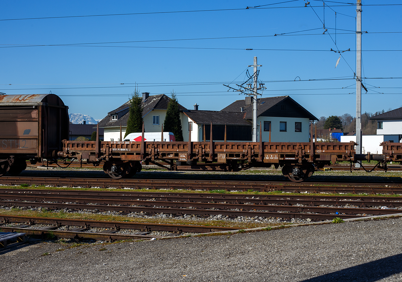 2-achsiger Flachwagen (Niederbordwagen) für Schotter und Sand, 43 84 3228 150-9 NL-RP, der Gattung NS Klmos 702, der Vermietungsfirma Railpro (voestalpine Railpro BV), am 04.11.2020 im Zugverband in Herdorf.