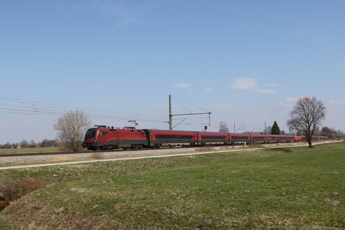 1116 260 war als Ersatzlok vor der defekten 1116 219 an einem Railjet im Einsatz. Aufgenommen am 23. März 2020 bei Übersee am Chiemsee.