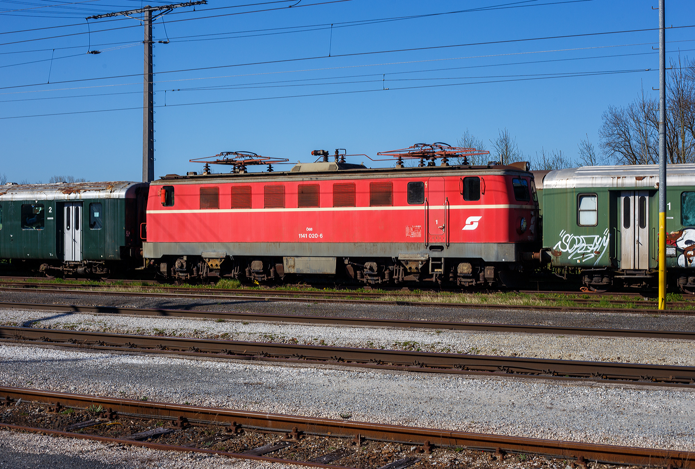 Die 1141.20 (91 81 1141 020-6 A-ÖGEG) der ÖGEG - Österreichische Gesellschaft für Eisenbahngeschichte GmbH, ex ÖBB 1141 020-6, ex ÖBB 1141.20, ist am 14 Januar 2025 beim Bahnhof Timelkam abgestellt. Bild leider nur aus einem Zug, hätten wir gewusst was hier alles herumsteht, dann hätten wir einen Stopp eingelegt.
