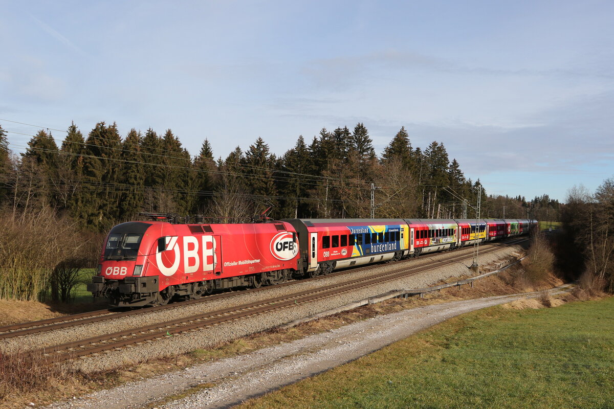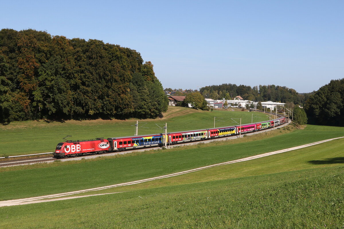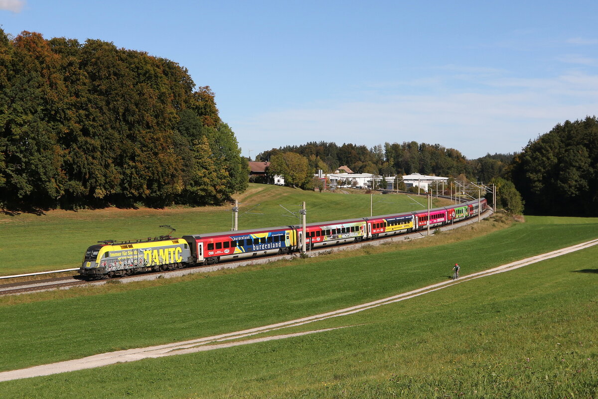 1116 225 "ÖFB" zog am 13. Oktober 2018 einen "Railjet" in Richtung Salzburg. Aufgenommen bei Bernau am Chiemsee.