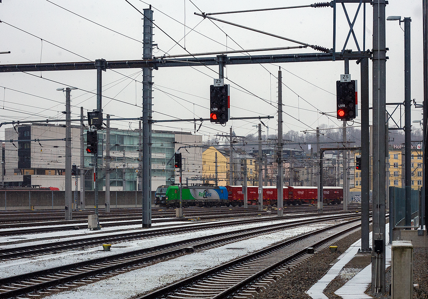Noch im Outlook der Rail&Sea Logistics GmbH (Seekirchen am Wallersee), aber nun an die ÖBB-Produktion GmbH vermietete SIEMENS Vectron MS 6193 193 (91 80 6193 273-0 D-ELOC) der ELL - European Locomotive Leasing (Wien) fährt am 15 Januar 2025 mit einem kurzen Rail Cargo MOBILER Multitainer Zug (2 achtachsige Drehgestell-Containertragwagen-Einheiten) durch den Hauptbahnhof Salzburg in Richtung Osten. Die Vectron MS wurde 2016 von Siemens Mobilitiy in München-Allach unter der Fabriknummer 22034 gebaut. Sie wurde in der Variante MS A17 ausgeführt und hat so die Zulassungen für Deutschland, Österreich, Polen, Tschechien, die Slowakei, Ungarn, Rumänien, Slowenien, Kroatien und Bulgarien (D-A-PL-CZ-SK-H-RO-SL-HR-BG). So besitzt die Variante MS A17 folgende Zugsicherungssysteme: ETCS BaseLine 3, sowie für Deutschland (PZB90 / LZB80 (CIR-ELKE I)), für Österreich (ETCS Level 1 mit Euroloop, ETCS Level 2, PZB90 / LZB80), für Polen (SHP, für Tschechien und Slowakei (LS (Mirel)), für Ungarn (ETCS Level 1, EVM (Mirel)), sowie für Rumänien, Slowenien und Kroatien (PZB90).