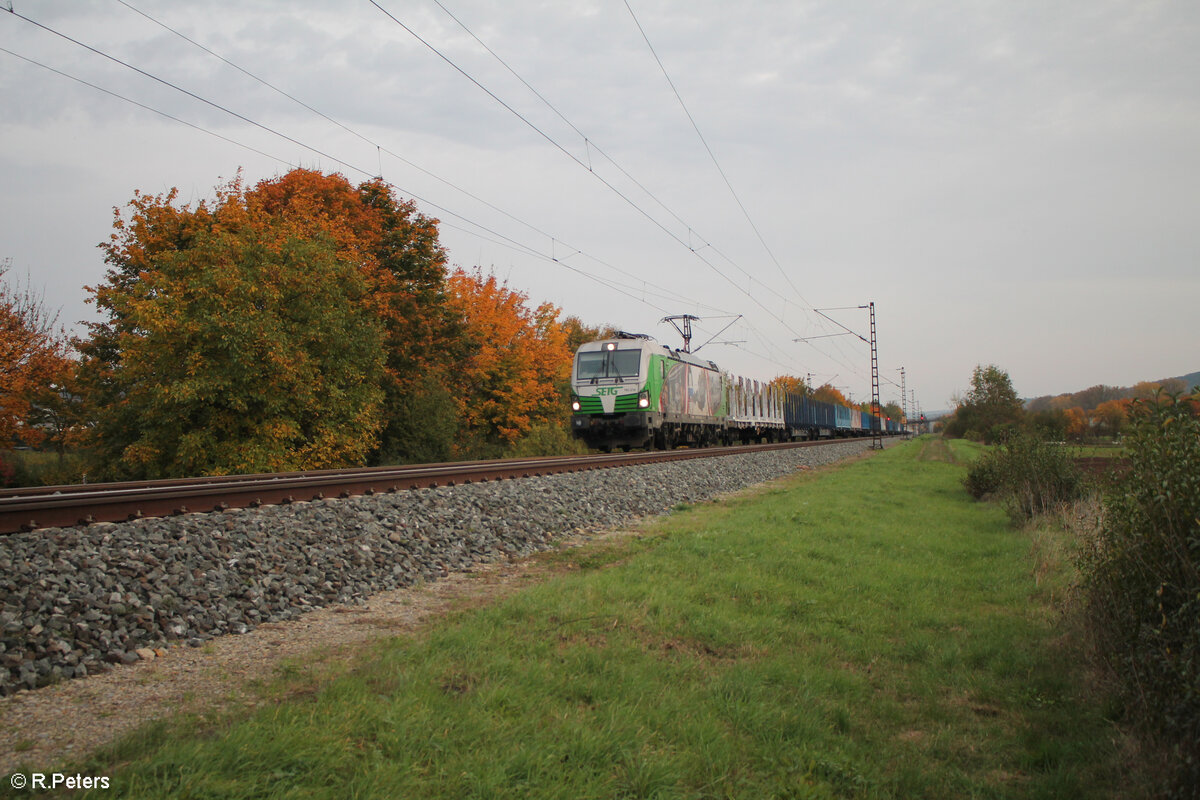 193 691-3  Bertha von Suttner - Waffen Nieder  zieht bei Treuchtlingen ein leeren SFlexwood Zug in Richtung Norden. 01.11.24