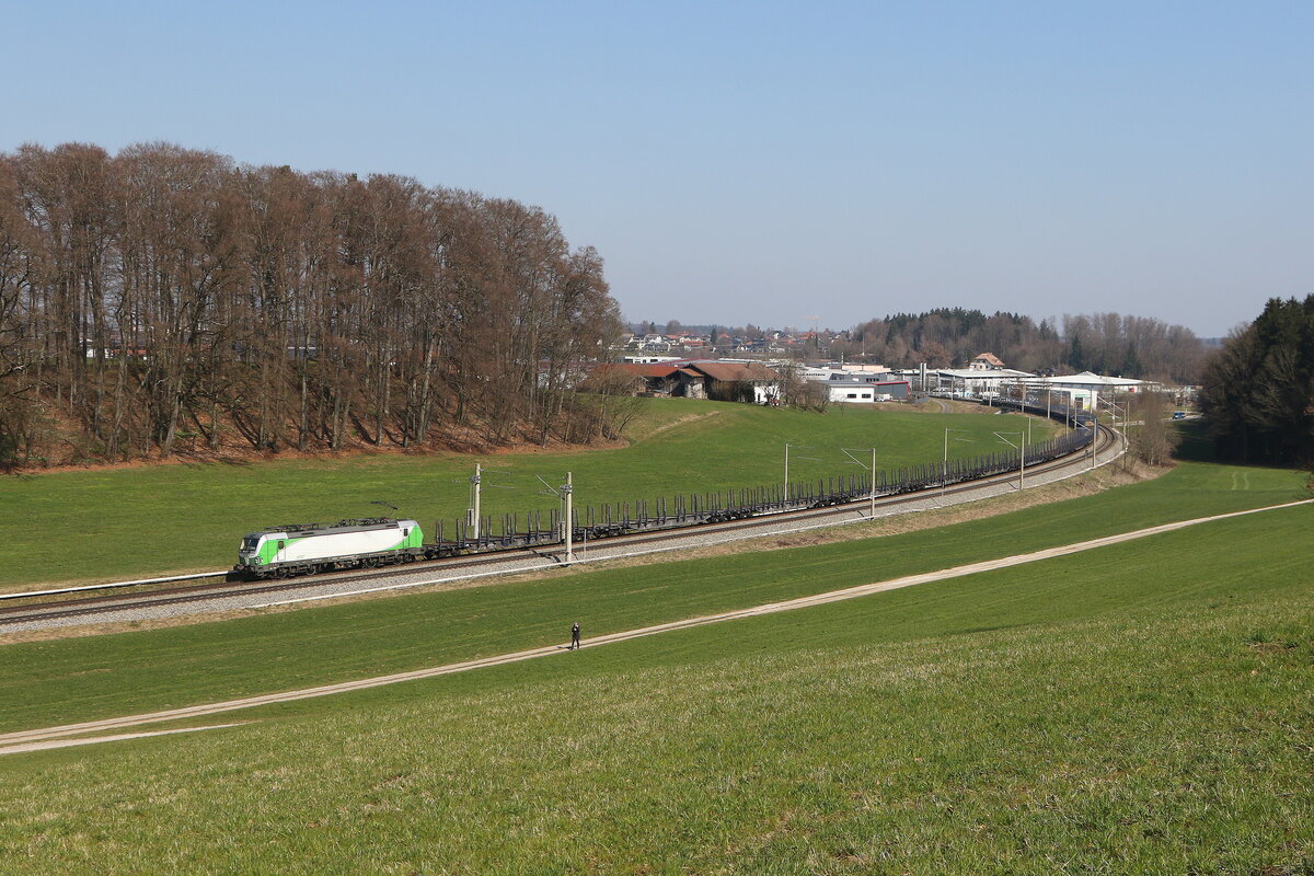 193 831 "Christian Doppler" war mit einem Holzzug am 9. Oktober 2020 bei Übersee am Chiemsee in Richtung Salzburg unterwegs.