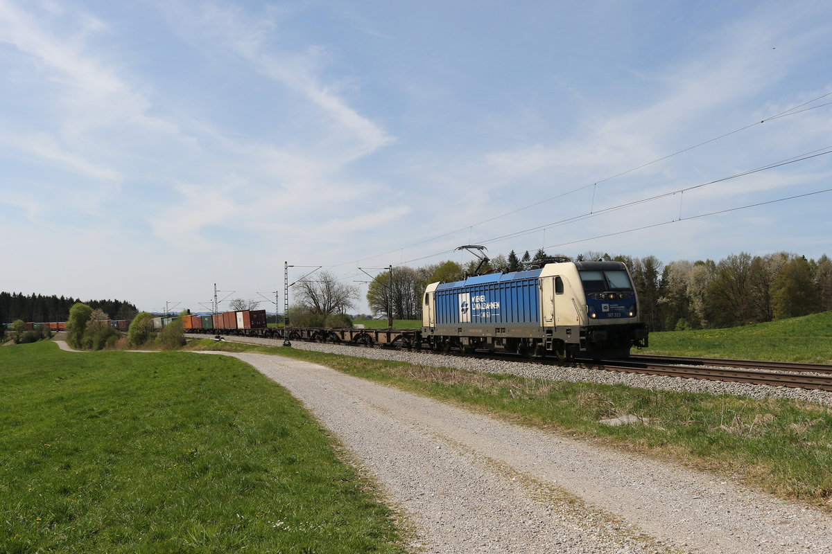 193 605 der "WLC" mit einem Containerzug aus München kommend bei Übersee am Chiemsee.