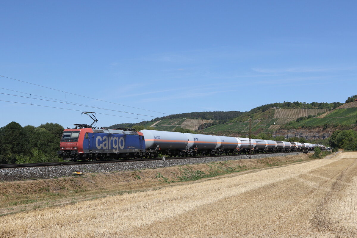 482 019 war am 4. Mai 20222 mit einem Containerzug bei Oberwesel in Richtung Koblenz unterwegs.
