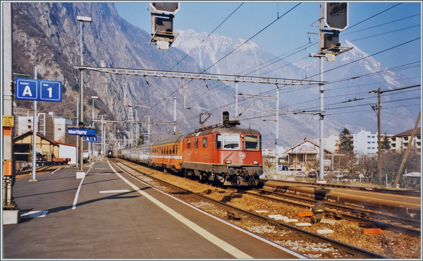 Nun hat sich die am Anfang dieser Bilderserie erwähnte SBB Re 4/4 II 11193 wieder an die Spitze des Zuges gesetzt und wartet mit ihrem vier Uaikk Wagen und dem Beh 4/8 4 / SNCF Z894 auf die Weiterfahrt nach Martigny.