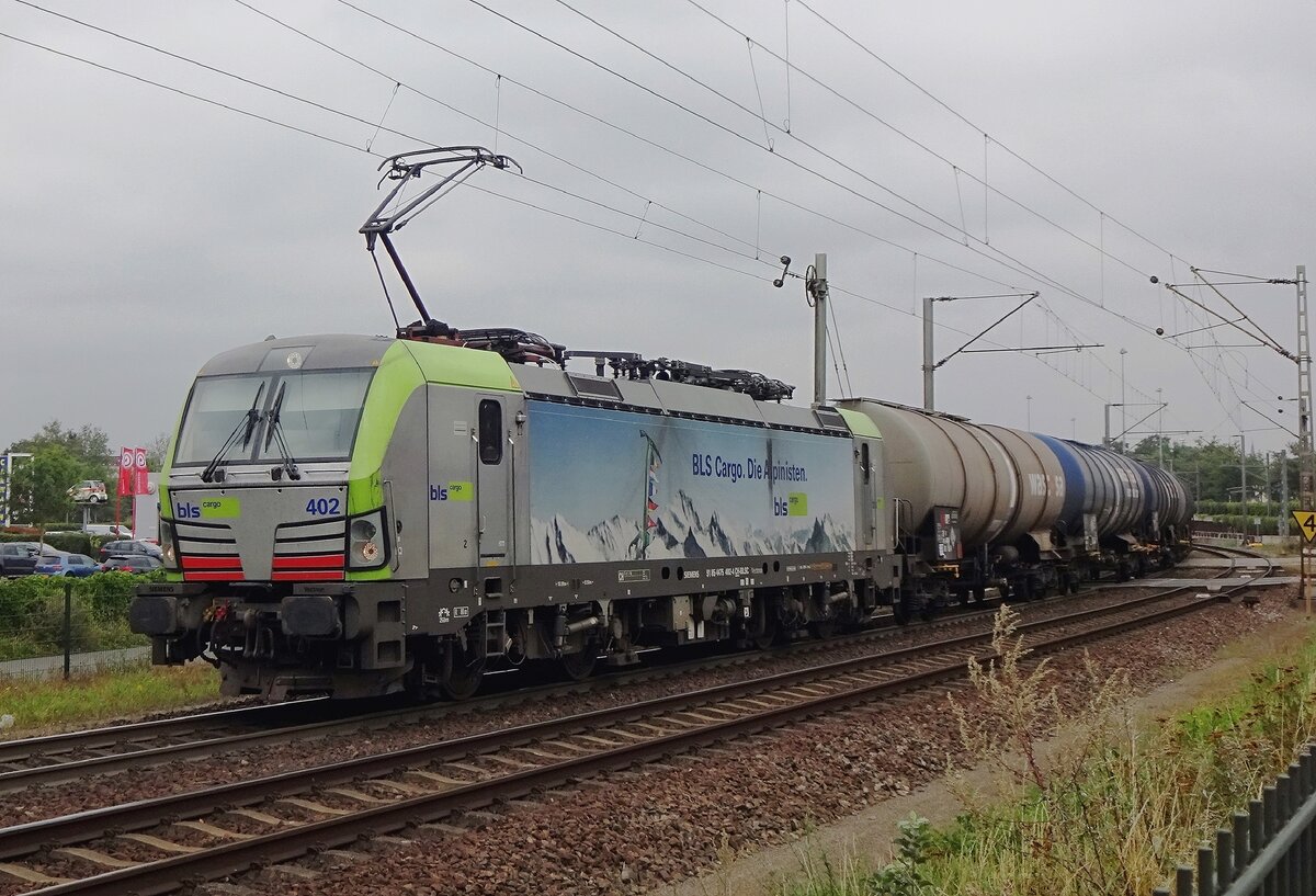 Am trüben 27 Augustus 2020 schlept BLS Cargo 475 402 ein Kesslewagenzug nach Trecate (IT) du7rch Venlo Vierpaardjes.