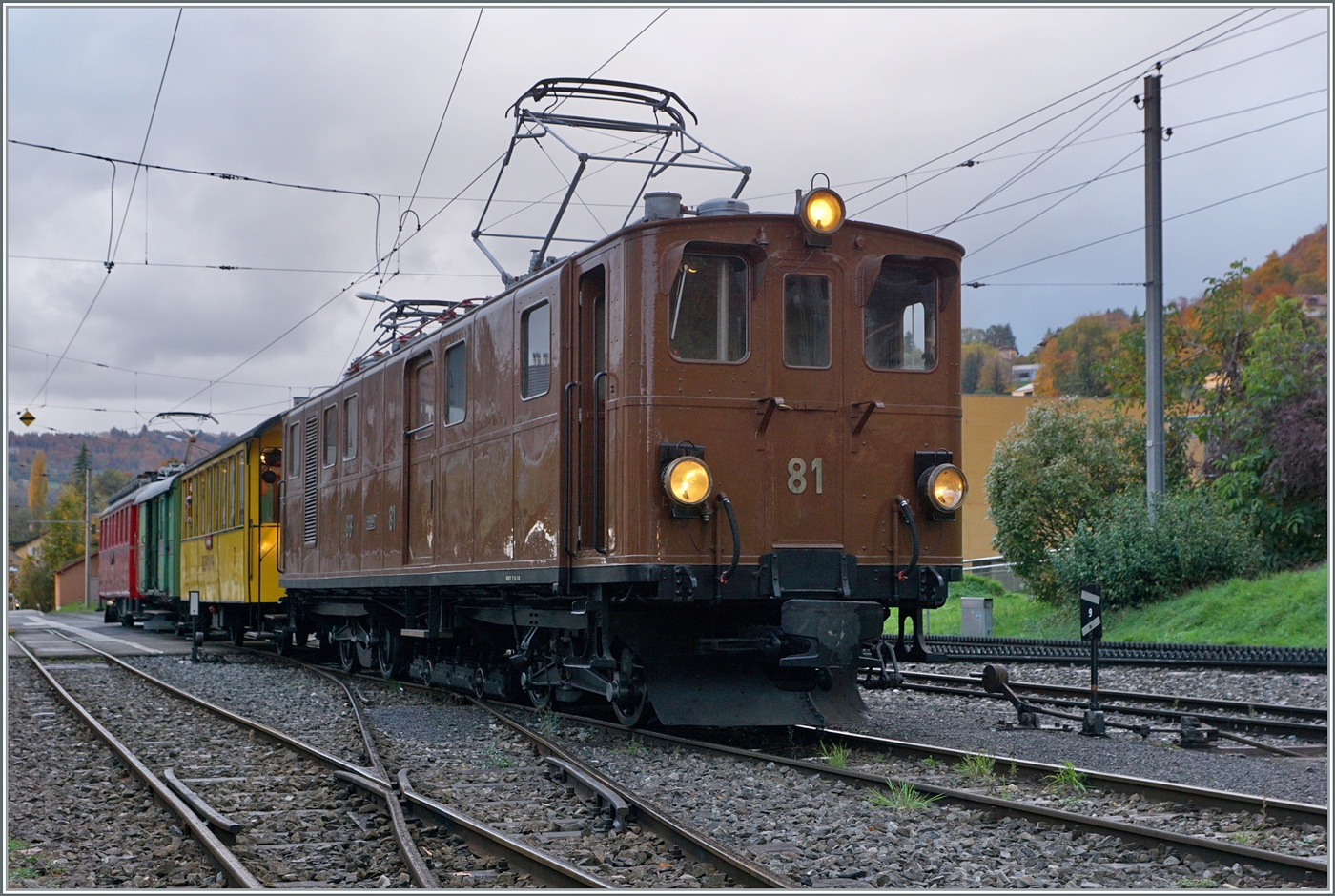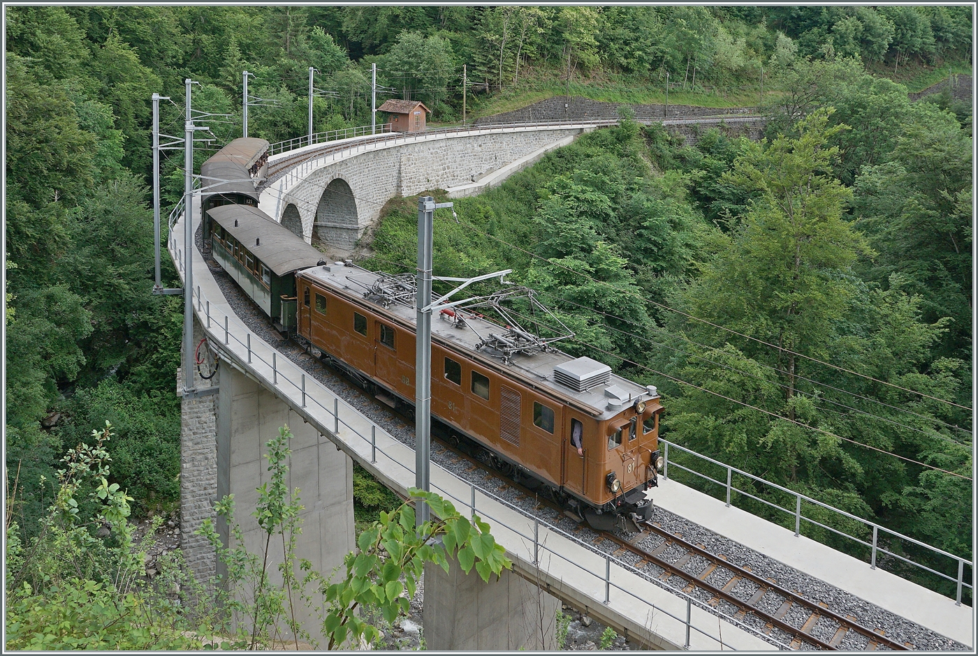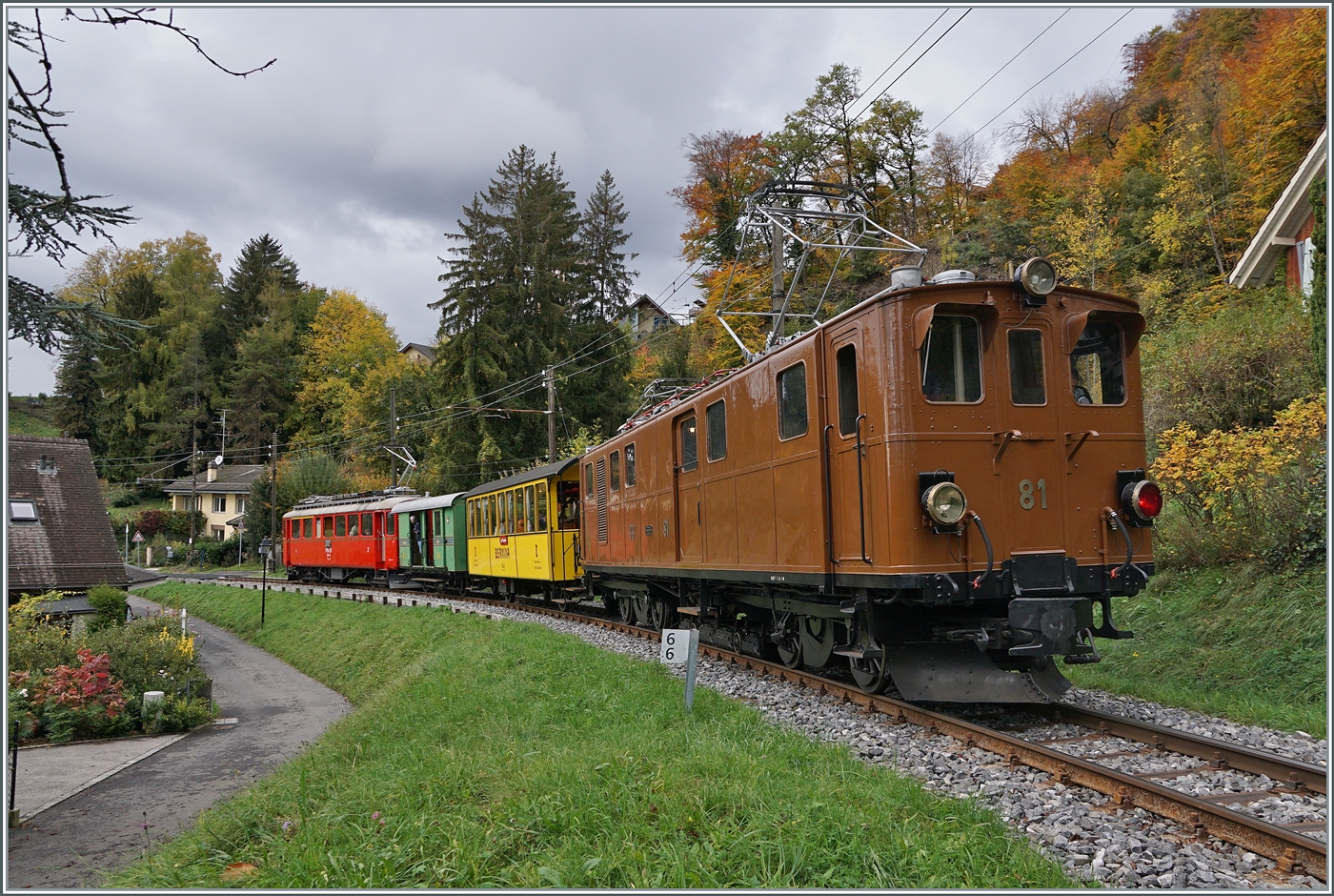 Unterwegs mit der ehemalige Berninabahn BB Ge 4/4 81 der Museumsbahn Blonay–Chamby, ex RhB Ge 4/4 181, ex BB Ge 4/4 81, ex BB Ge 6/6 81, am 27. 05.2023 von Blonay hinauf in Richtung Chamby.