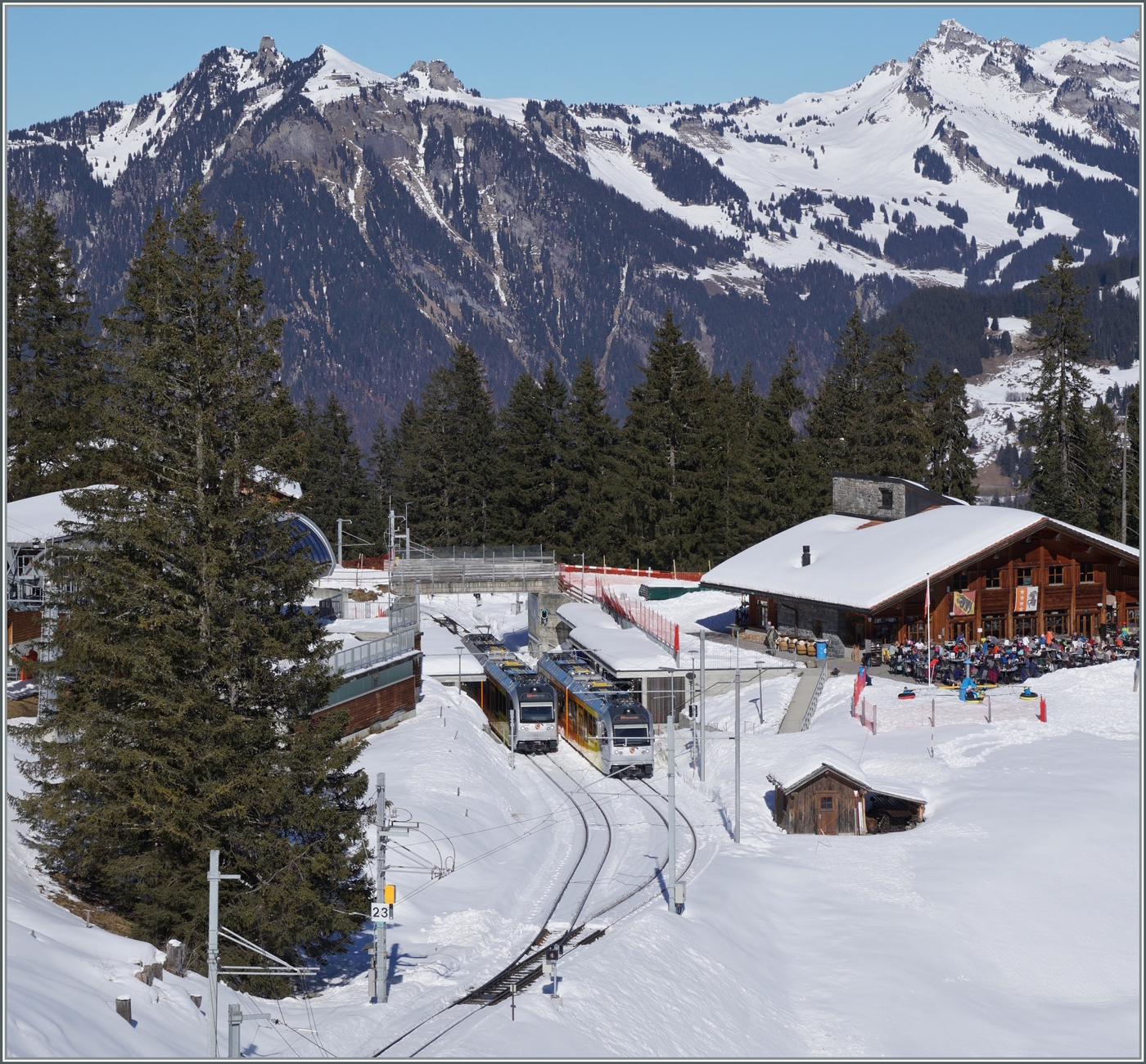 "Mischbetrieb": in Winteregg kreuzen ich der BLM Be 4/4 31 "Lisi" unterwegs nach Grütschalp und der BLS Be 4/6 101 Eiger auf der Fahrt nach Mürren.