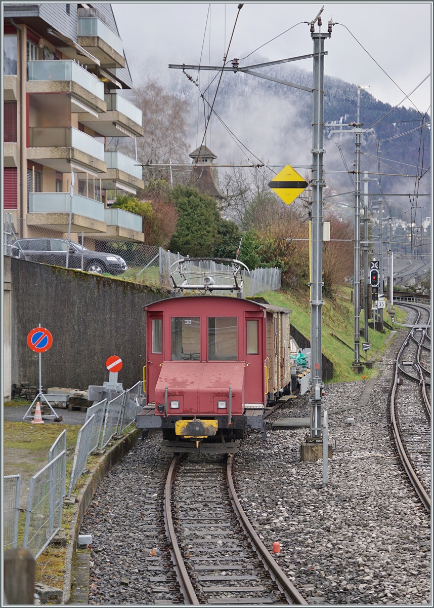 Ein Blick über die Zahnradweiche in Blonay in Richtung Vevey mit dem Lokschuppen im Hintergrund. Ende März 2026 wurde im Gleis 3 und 4 die Zahnstange entfernt und die Zahnstangeneinfahrt wie vor vielen Jahren in die Ausfahrt in Richtung Les Pléiades verlegt.
