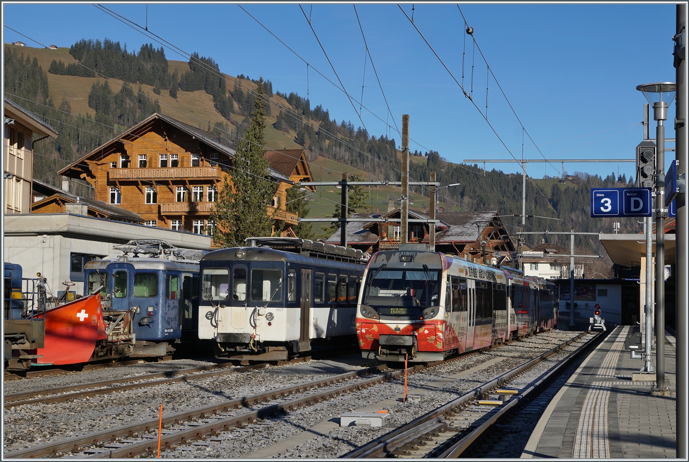 Der TPC BDe 4/4 402 mit Bt (ex BLT) und dem BDe 4/4 403 ist auf dem Weg von Aigle nach Les Diablerets und hat Le Sépey verlassen um nun (erneut) in Les Planches anzukommen.