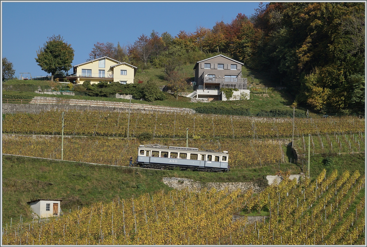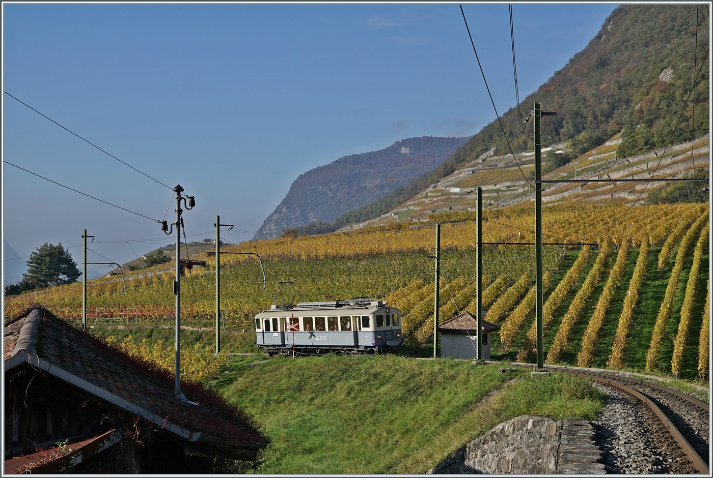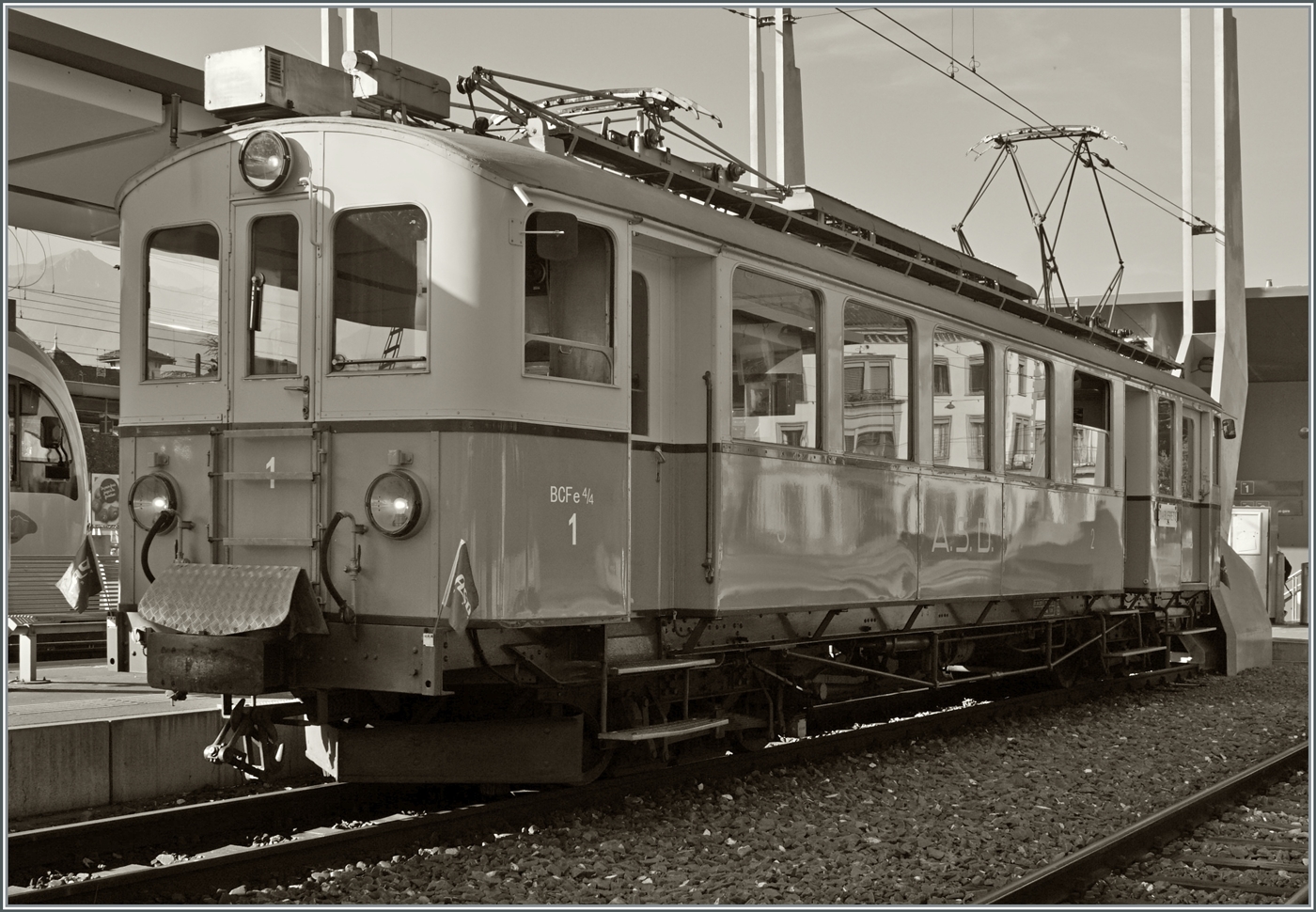 Drei Generationen ASD Triebzüge: In Aigle steht 1913 gebaute und 1940 umgebaute BCFe 4/4 N° 1 abgestellt, Diese Triebwagen waren seit der Eröffnung der Bahn 1914 bis in der ersten Hälfte der 80er im Einsatz.