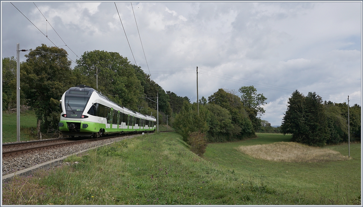 Schon fast ein Zugsuchbild: der Blick gleitet über das weite Jura Hochtal nach La Sagne. Dort ist ein TransN cmn ABe 4/8 auf der Fahrt als R22 zu erkennen.