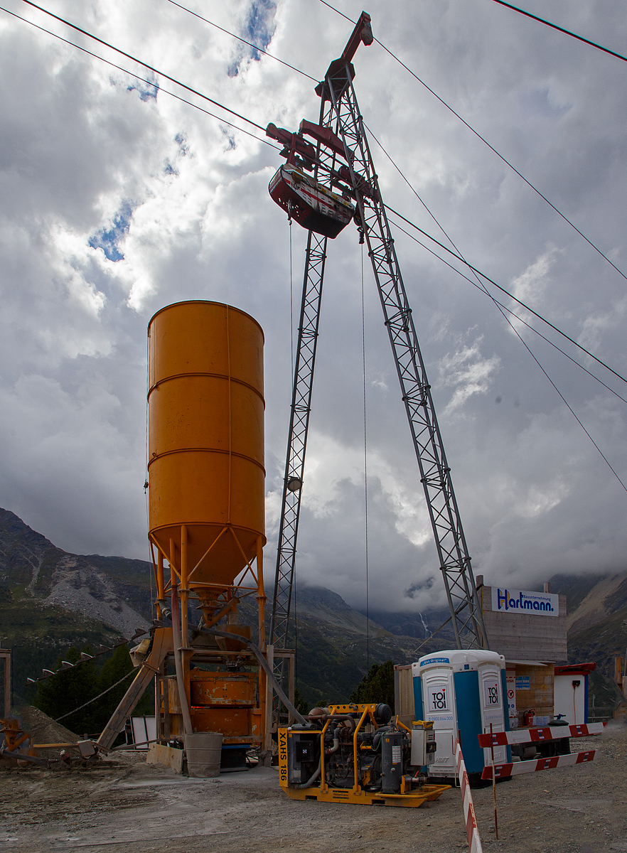 Unterhalb Alp Grüm werden die Alp Grüm der Berninabahn erneuert, daher gibt es eine Materialseilbahn von Alp Grüm hinab zu den Galerien, hier am 06.09.2021. So wird oben in Alp Grüm der Beton gemischt und dann mit der Seilbahn hinab gefahren.