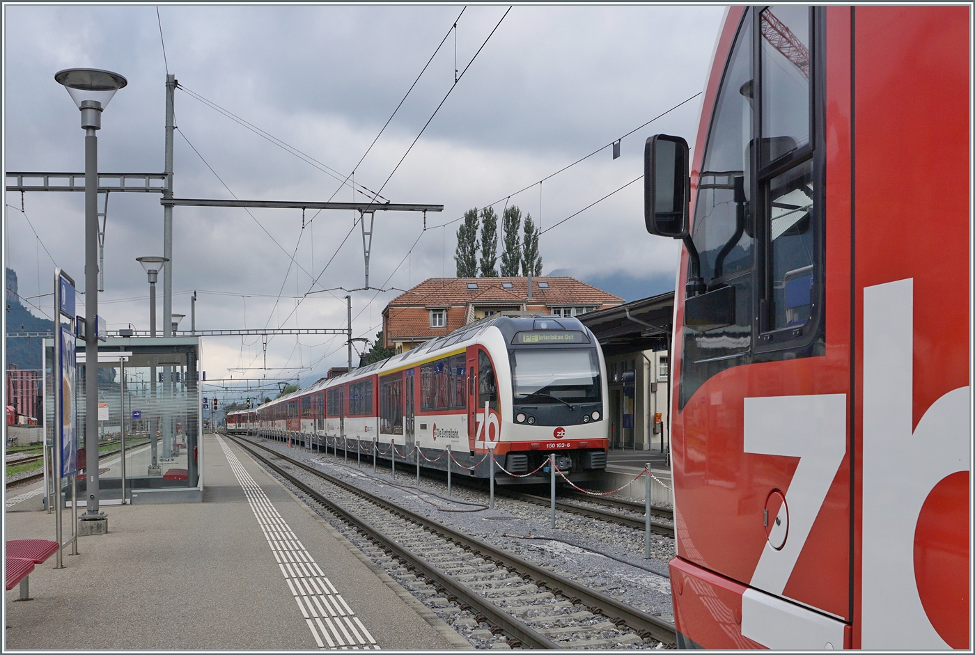 Der zb (Zentralbahn) ABeh 150 103-6, ein siebenteiliger Stadler ADLER (alpiner, dynamischer, leiser, edler Reisezug), gekuppelt mit dem zb ABeh 160 005-2, ein dreiteiliger Stadler FINK (Flinke innovative Niederflur-Komposition), erreichen am 09.09.2021 als Interregio (IR) nach Luzern den Bahnhof Brienz.
