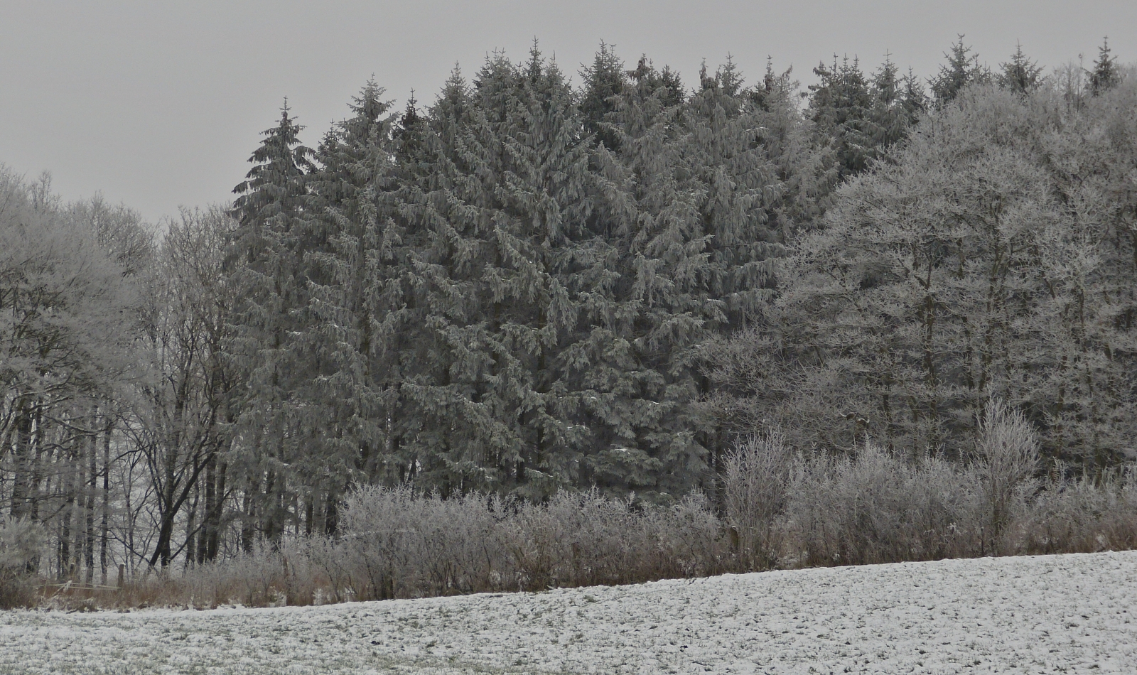 Winter Impressionen an der Straße Schummanseck nach Pommerloch, Raureif glänzt an den Hecken und Sträucher entlang der Straße bei herrlichem Wanderwetter, Sonnenschein und blauem Himmel. 20.01.2024