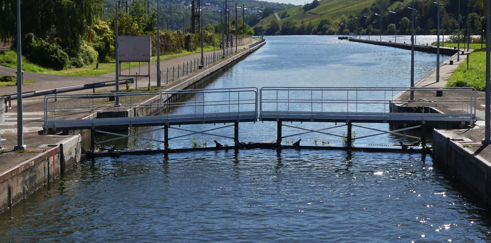 Schiffrundfahrt auf der Mosel, das vor uns fahrende Flusskreuzfahrtschiff MS Princesse Royal muss genau wie wir vor der Schleuse von Apach warten bis das sich darin befindliche Schiff die Schleusenkammer verlassen hat.. 09.2023
